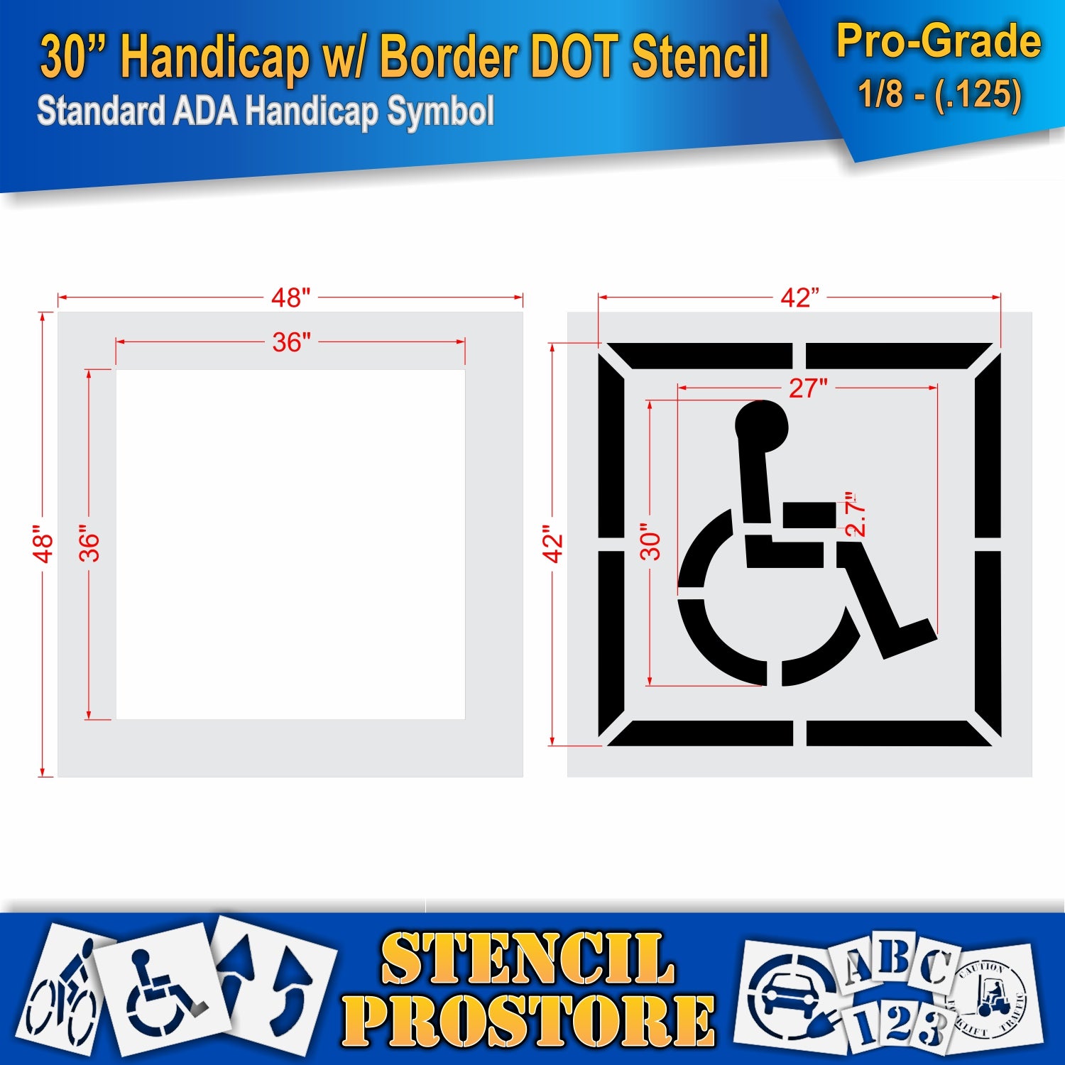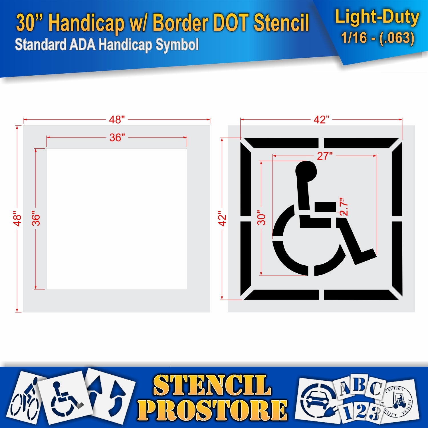 Ideal for marking parking lots, sidewalks, ramps, and designated handicap zones, this stencil meets ADA specifications with a 30-inch character height by 27-inch width and background size of 36-inch by 36-inch . The 48" x 48" plastic base provides a stable template that’s easy to align and clean between uses.